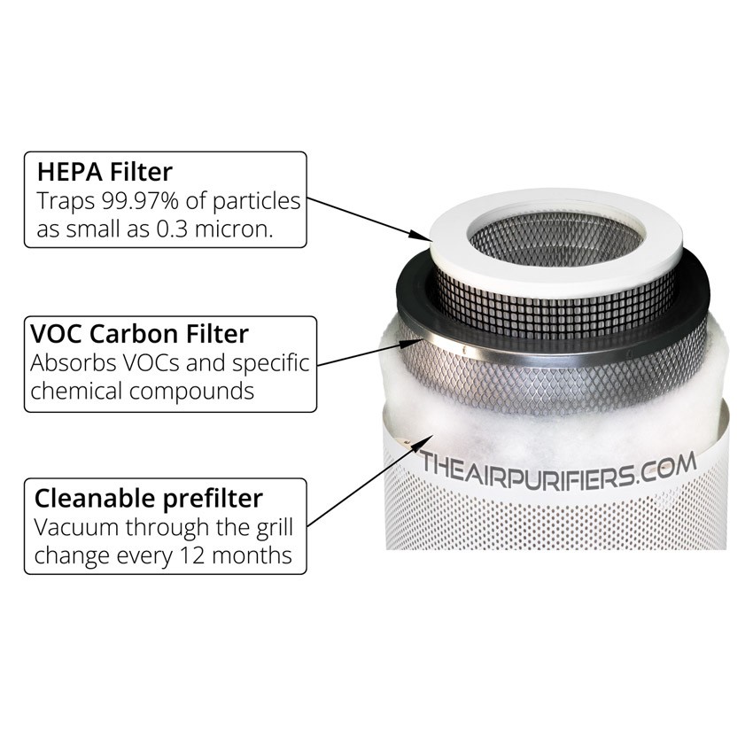 AirPura V400 carbon canister filter contains 8 lbs. of Superblend specially enhanced VOC adsorbent for effective and speedy removal of VOCs and toxic chemicals.