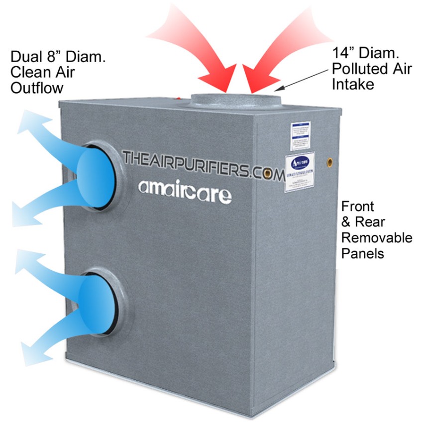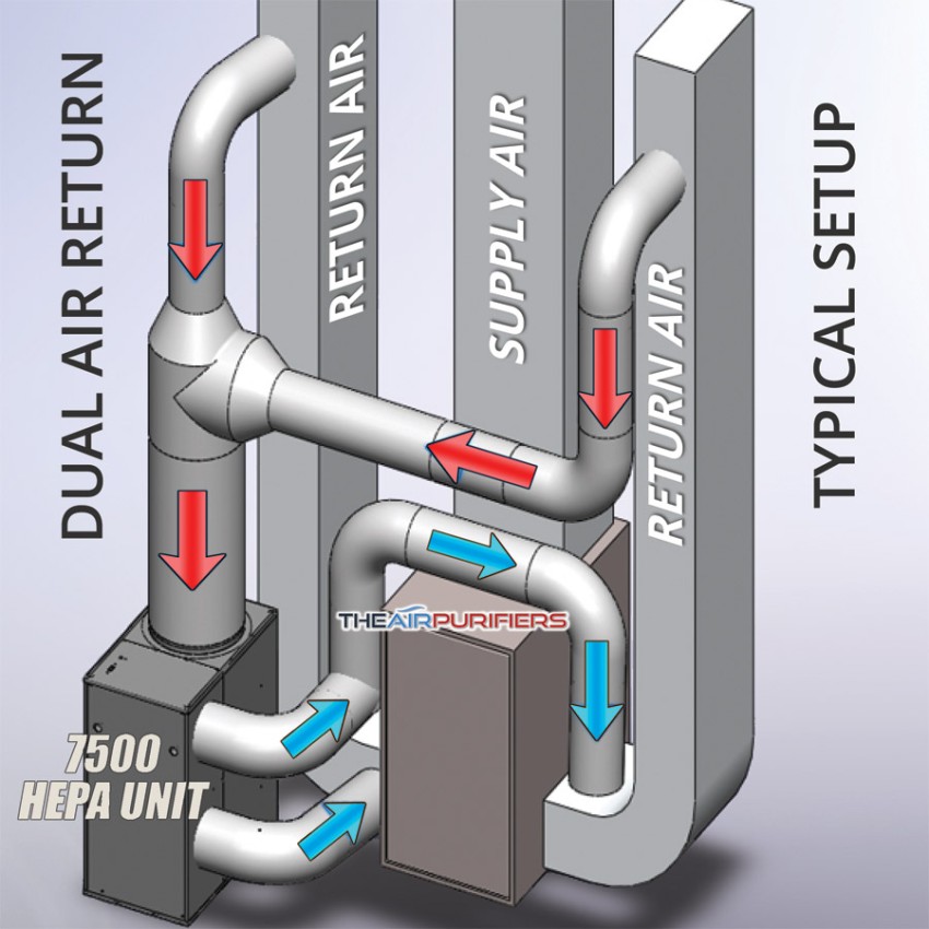 Amaircare 7500 AirWash BiHEPA whole house air purifier installs next to the house's HVAC system air handler (furnace) in a basement, a utility room or an attic and connects to the return section of the air duct work system. The Amaircare 7500 BiHEPA whole house air purifier draws the portion of a polluted air (about 30%) from a return air duct, pushes it through the high-efficiency dual air filtration system of the unit and returns the purified air back into the air duct for a further distribution throughout the entire house or office space using the existing air duct system.