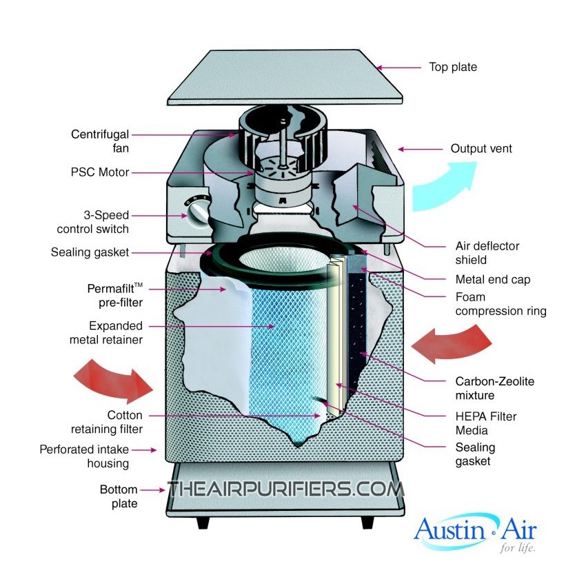 Austin Air HealthMate Plus Junior air purifier is equipped with the same standard for Austin Air 200 series units reliable and energy efficient Motor/Fan.